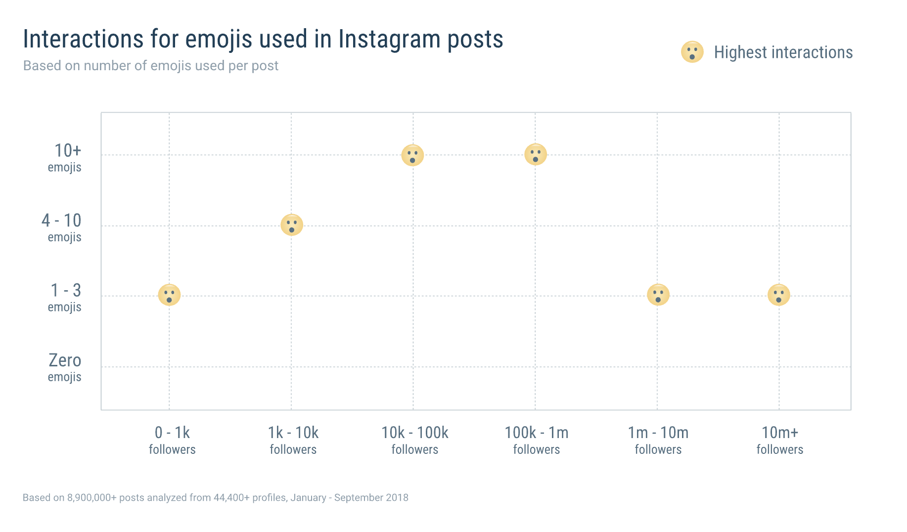 Ahora resulta que los emojis son mejores que los HT. Los perfiles medianos parecen beneficiarse más del uso de emojis. Estos grupos tienden a recibir más interacciones cuando usan más de 10 emojis. Los perfiles más pequeños parecen estar mejor cuando usan de 1 a 3 o de 4 a 10, dependiendo de su audiencia.