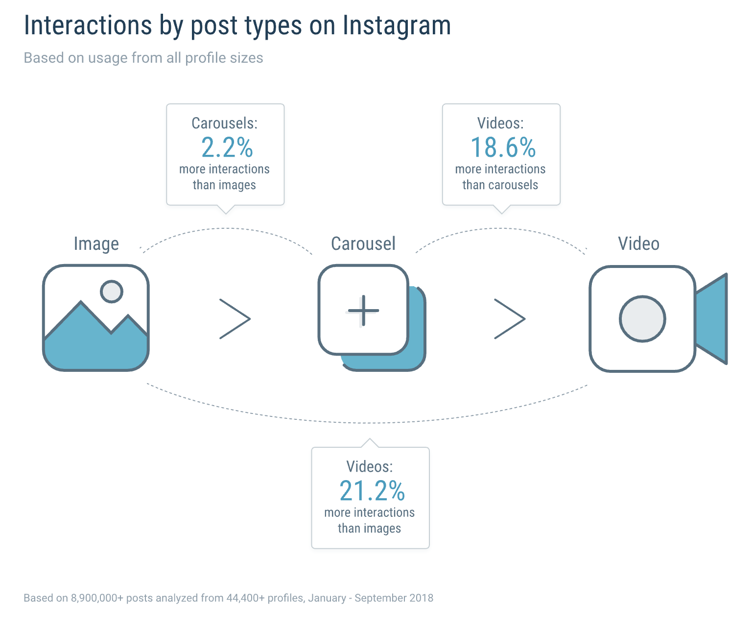 Al observar los tres formatos por separado, se puede ver que las publicaciones de video recibieron más interacciones que las imágenes o los carruseles. Al comparar cada tipo de publicación entre sí, recibimos los siguientes resultados de interacción: