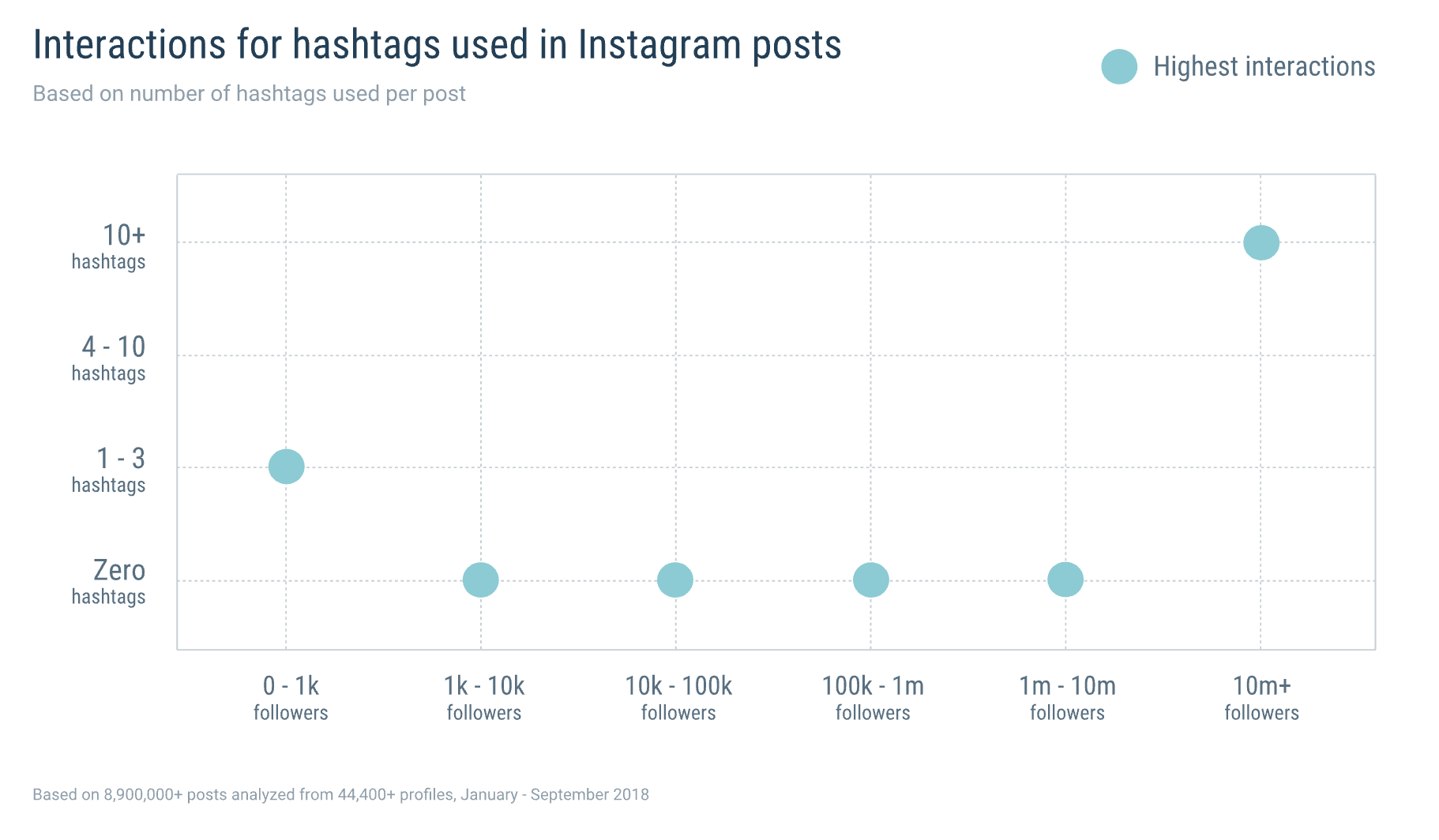 La mayoría de los perfiles usan de 1 a 3 etiquetas, pero tienden a obtener más interacciones cuando no las usan todas. La única excepción es el grupo de perfiles con más de 10 millones de seguidores; sus publicaciones con más de 10 hashtags tienden a obtener más interacciones.