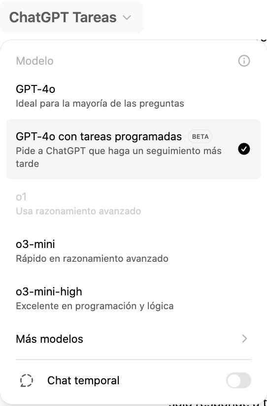 Para activarla: selecciona «GPT-4 con tareas programadas» en el selector de modelos de ChatGPT, ya sea en móvil o desktop, y una vez en ese chat, especifica qué necesitas y cuándo lo necesitas. Obviamente esto solo funciona en las versiones de paga de ChatGPT.