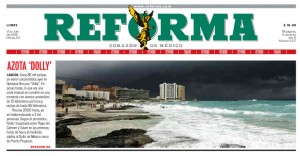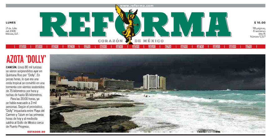 Aunque usted no lo crea, éste cielo era el paisaje del paradisiaco Cancún hace apenas unas horas. Dolly sorprendió a todos al entrar con ráfagas de hasta de 95 km por hora. La foto fue publicada en el Reforma.