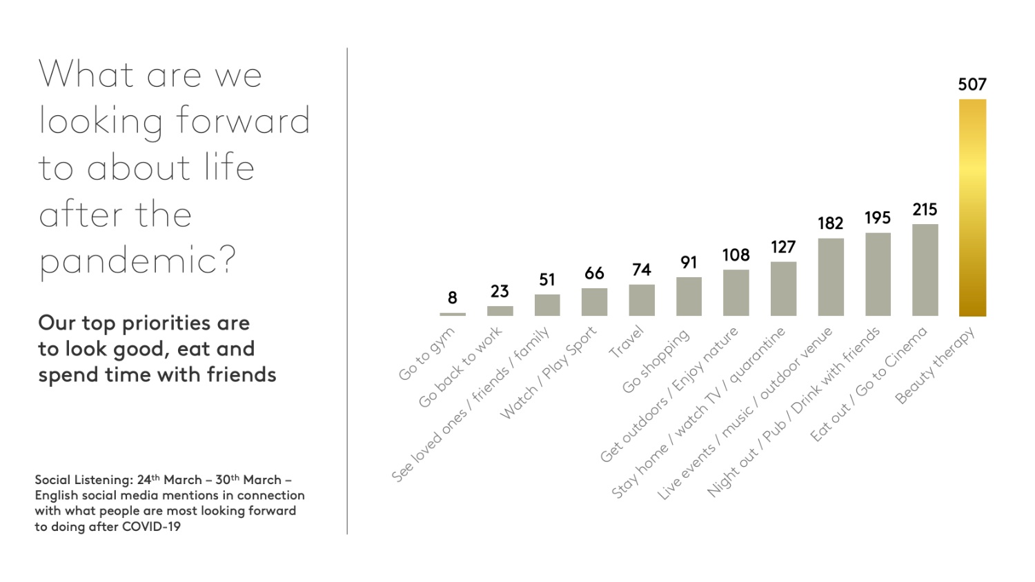 Lo creas o no, aquí la medalla de oro se la lleva una buena terapia de belleza, seguida de las salidas al cine y a comer, compartir con los amigos, eventos musicales y… ¡es increíble! ¡pasar el día en casa, tal como hacemos ahora!… aunque claro, relajados, no obligados y sin miedo.