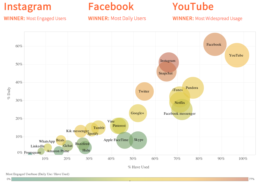 Como puede verse en la gráfica, Instagram es la red donde los jóvenes están más enganchados; Facebook la que más utilizan diariamente y YouTube la de uso más extendido. No es ninguna sorpresa, por supuesto; sin embargo llama la atención el buen lugar de Pandora, y en lo que tampoco es de admirarse, Twitter y Snapchat también lucen cómodos.