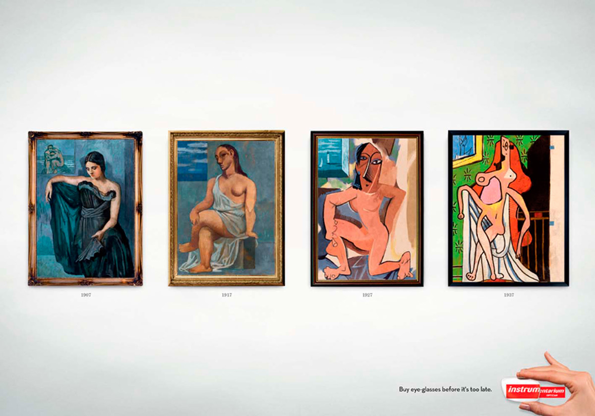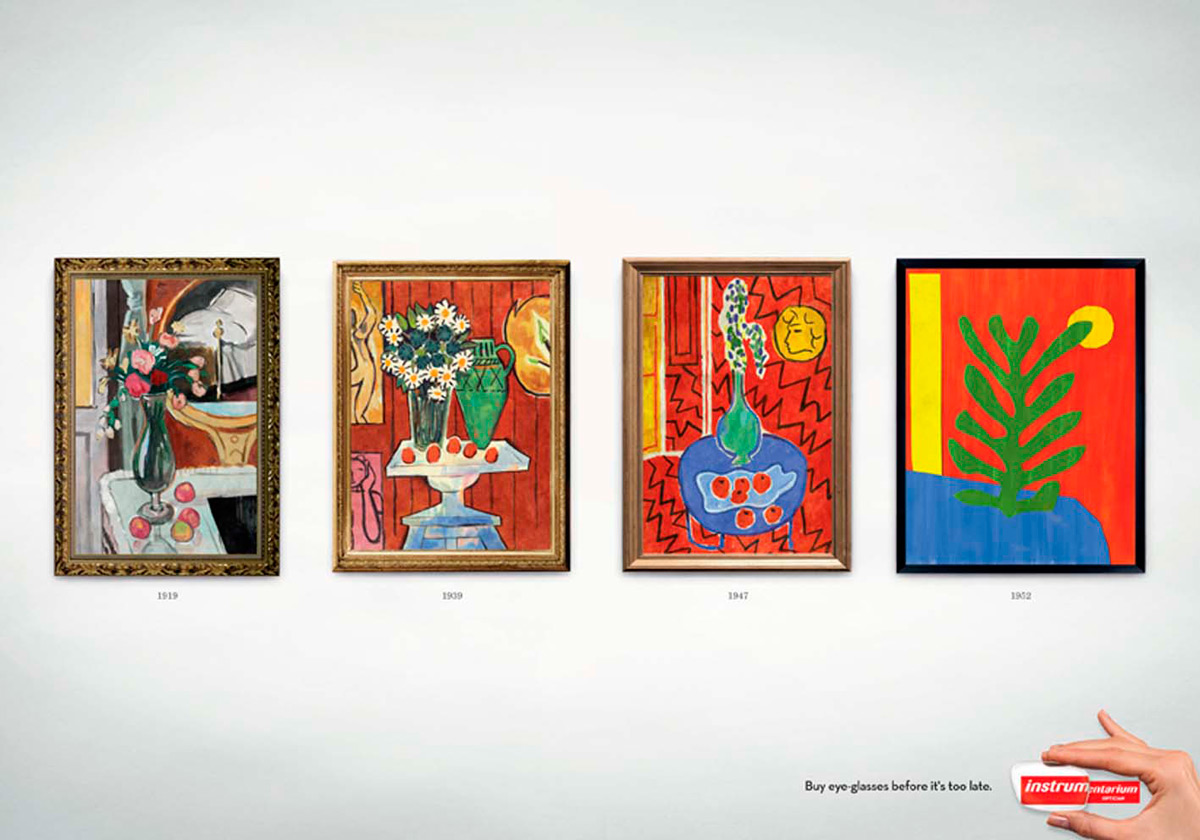 Esta campaña fue creada para Instru Optiikka Oy, comercializadora de lentes y accesorios. La compañía radica en Finlandia. El diseño es para la marca Instrumentarium y con un poco de humor, alude a que el pintor impresionista francés Henri Matisse y el artista moderno español Pablo Picasso, pitaban así porque padecían un problema de vista que se fue agravando.