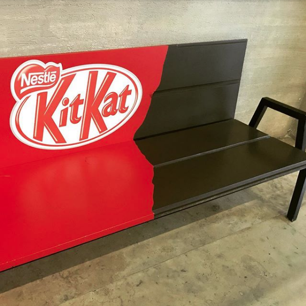 Esta simple banca de KitKat de @nestlemx simula ser una barra de chocolate saliendo de su empaque. ? No necesitó de realidades virtuales, aumentadas o pensar en algoritmos… ? No… simplemente es… y en su sencillez es tremendamente vistosa.?