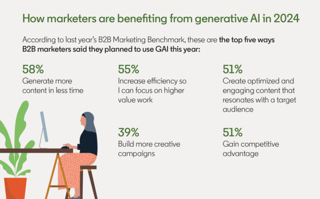 - 66% de las y los marketers B2B ya utilizan alguna herramienta de IA en sus operaciones, lo que demuestra la importancia de la IA para profesionales de marketing; pero ¿cómo?