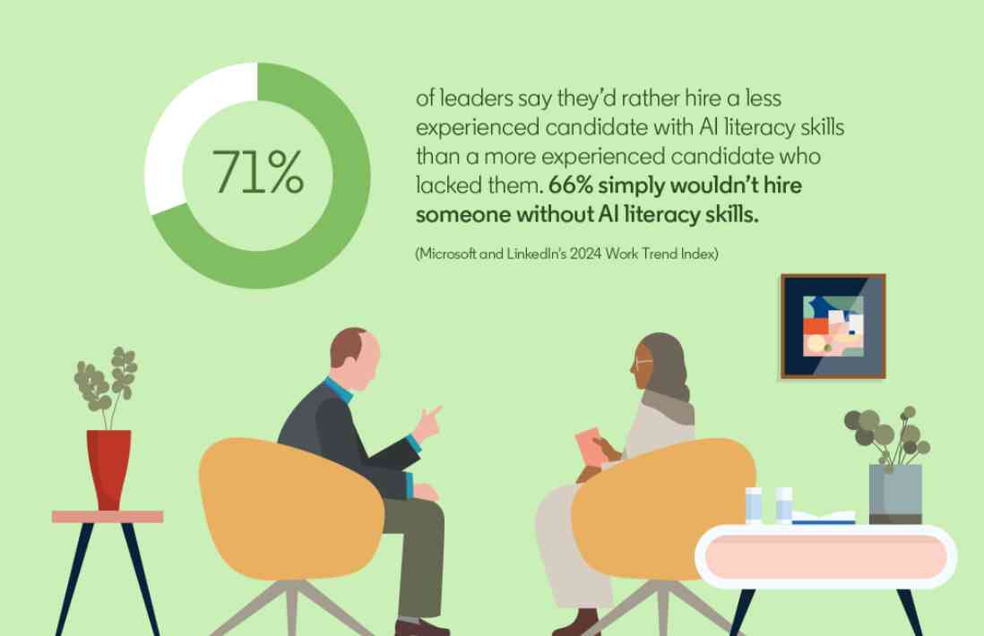 El Índice de Tendencias Laborales 2024 de Microsoft y LinkedIn encontró que más de dos tercios (71%) de los líderes dicen que preferirían contratar a un candidato menos experimentado con conocimientos de inteligencia artificial que a un candidato más experimentado que careciera de ellos.