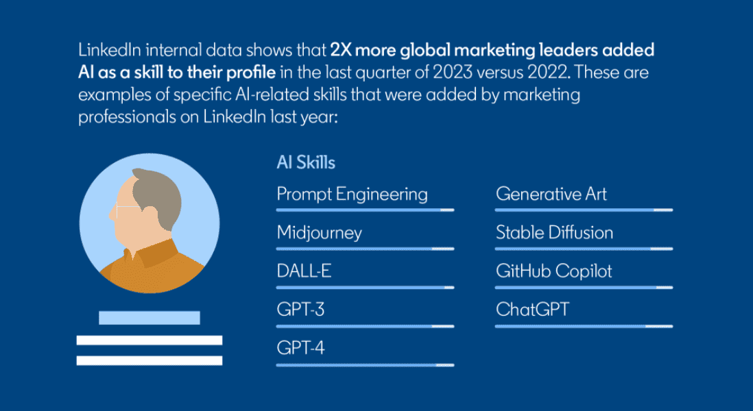 La data de Linkedin señala que el número de personas líderes en marketing con habilidades de IA, se duplicó en un año. Un enorme insight que muestra la importancia de la IA para profesionales de marketing.