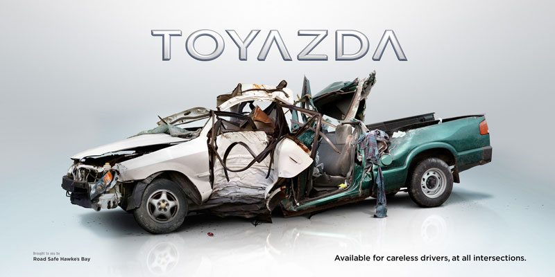 Brillante campaña de Marketing Social en pro de un manejo más cuidadoso. La fusión de dos autos en uno sólo (gracias a un choque), generando con ello un «nuevo» modelo, da pie a una innovadora campaña de precaución. En términos de retórica estamos ante una metonimia efecto-causa, es decir, mostrar la consecuencia para deducir la causa.