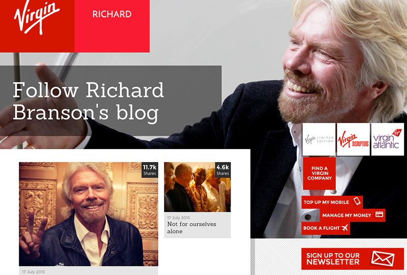 Branson no se limita a contar historias y a ser uno de los CEOs más humanos y exitosos… ¡se da el tiempo de hacer contenidos para su blog! ¿Cada cuándo publica? ¡Diario! ¡Sí! ¡Diario! Sobre sus vivencias, sobre la compañía, sus pensamientos, planes… y además lo distribuye en redes sociales. Aquí lo importante no es si es él mismo quien redacta el contenido o tiene un escritor fantasma que siempre le acompaña; lo importante es el ritmo y la calidad de la actualización.