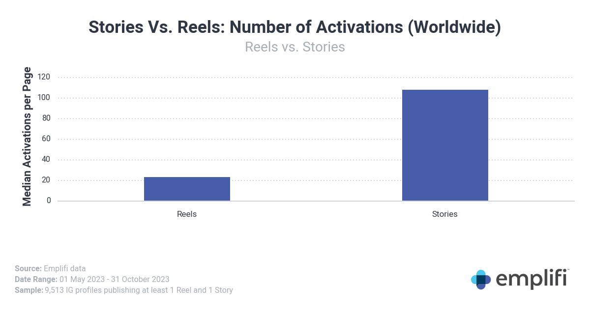 Sin embargo, las marcas siguen publicando más Stories que Reels. Entre mayo y octubre de 2023, el número de Instagram Stories publicadas por las marcas globales fue cinco veces superior al número de Instagram Reels publicados.
