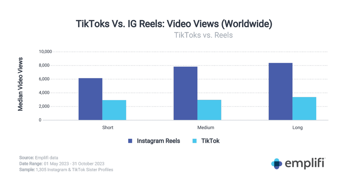 Emplifi descubrió que los videos de mayor duración en Instagram generan más visualizaciones o views en comparación con los videos de duración corta y media, mientras que las visualizaciones de los videos de TikTok se mantenían en el mismo rango, independientemente de la duración del video.