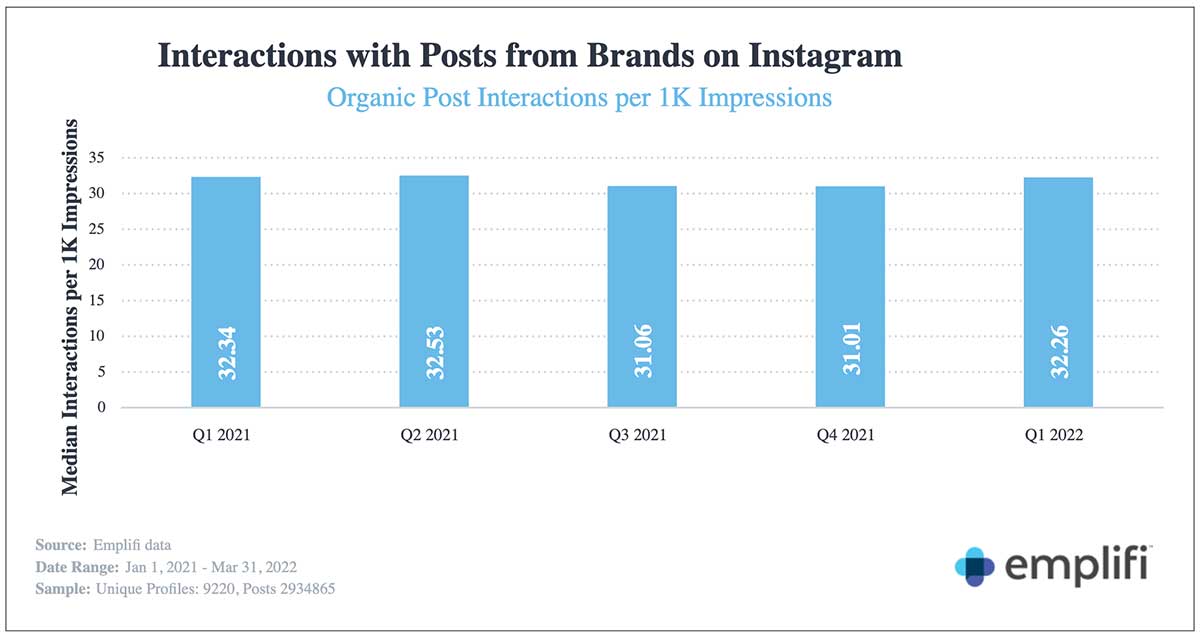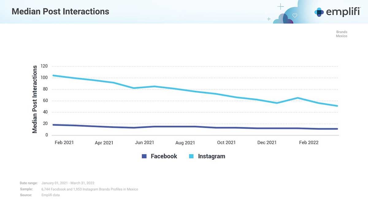 - Instagram permanece estable: En contraste, las publicaciones en Instagram reciben una media de poco más de 32 interacciones por cada 1,000 impresiones, una cifra que se ha mantenido relativamente constante durante el último año.
