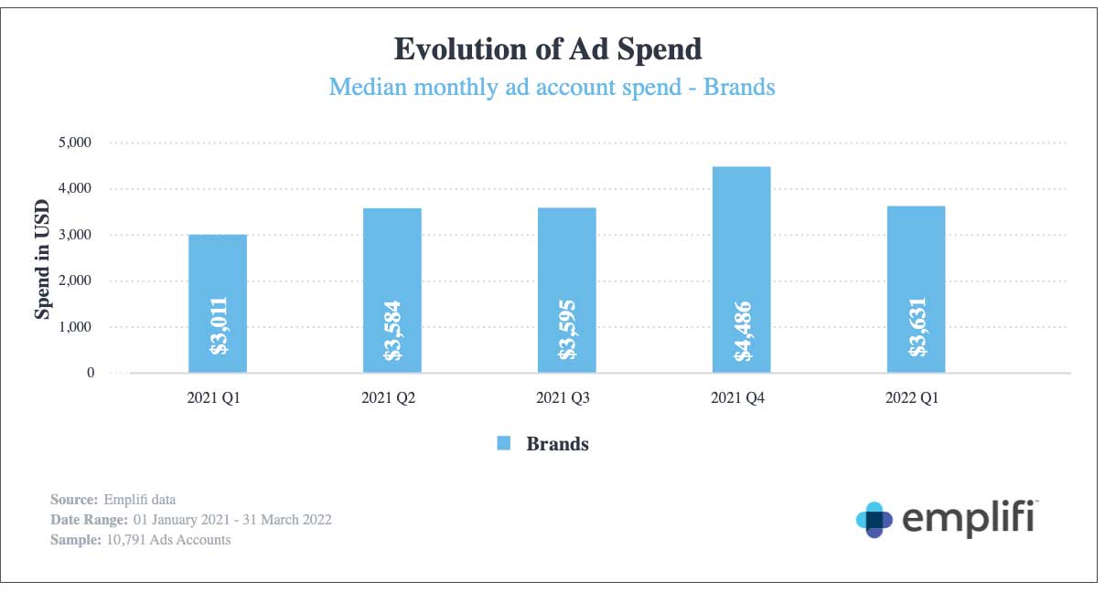 De acuerdo con los hallazgos más recientes de Emplifi, el gasto publicitario mensual promedio por marca fue de $3,631 dólares en el primer trimestre de este año, lo que representa 19% menos que en el pico máximo de la temporada navideña del cuarto trimestre de 2021. Esto representa, no obstante, un incremento de casi 21% con respecto al gasto promedio de poco más de $3,000 dólares del primer trimestre de 2021.