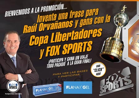 Una excelente oportunidad para todos aquellos que gusten del copy. Fox Sports y Flanax Gel organizan un concurso para redactar una frase creativa que Raúl Orbañaños pueda decir durante los partidos de la Copa Libertadores. La frase ganadora se hará acreedora a un viaje para dos personas a la GRAN FINAL DE LA COPA LIBERTADORES 2007.