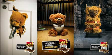 Espléndidos impresos para las golosinas Knaz, aprovechando la denotación y connotación del anglicismo Nut (nuez y loco, respectivamente).