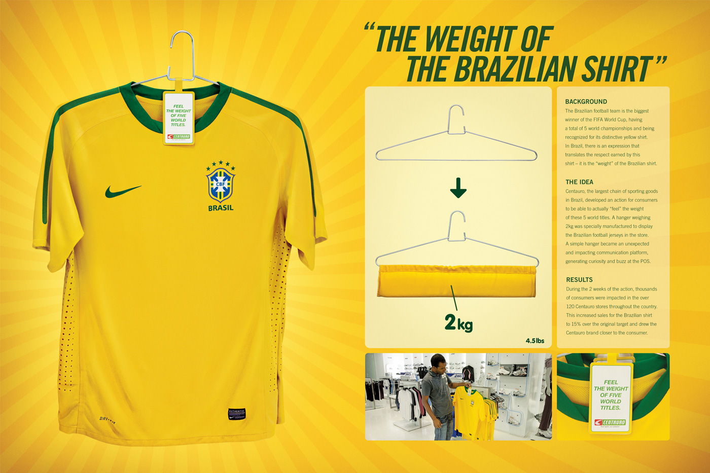 Ésa fue seguramente la pregunta que se hicieron los de las tiendas Centauro en el país carioca, en donde le agregaron a los jerseys una etiqueta con la leyenda «Siente el peso de cinco títulos mundiales.» Cuando los clientes tomaban el gancho para apreciar la prenda ¡Oh sorpresa! efectivamente la camiseta tiene peso.