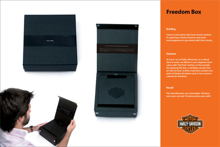 Se trata de una caja con la frase «Siéntete libre» en su parte exterior. Dicha caja fue entregada a ejecutivos de alto nivel, clientes potenciales de Harley Davidson. El horario de entrega fue las últimas horas laborales del viernes. Cuando el destinatario abría la caja se activaba un ventilador que lanzaba el aire hacia su rostro; voila!, la experiencia Harley se había hecho presente; un pequeño mensaje y el logo de la clásica casa de motocicletas complementaban el BTL.