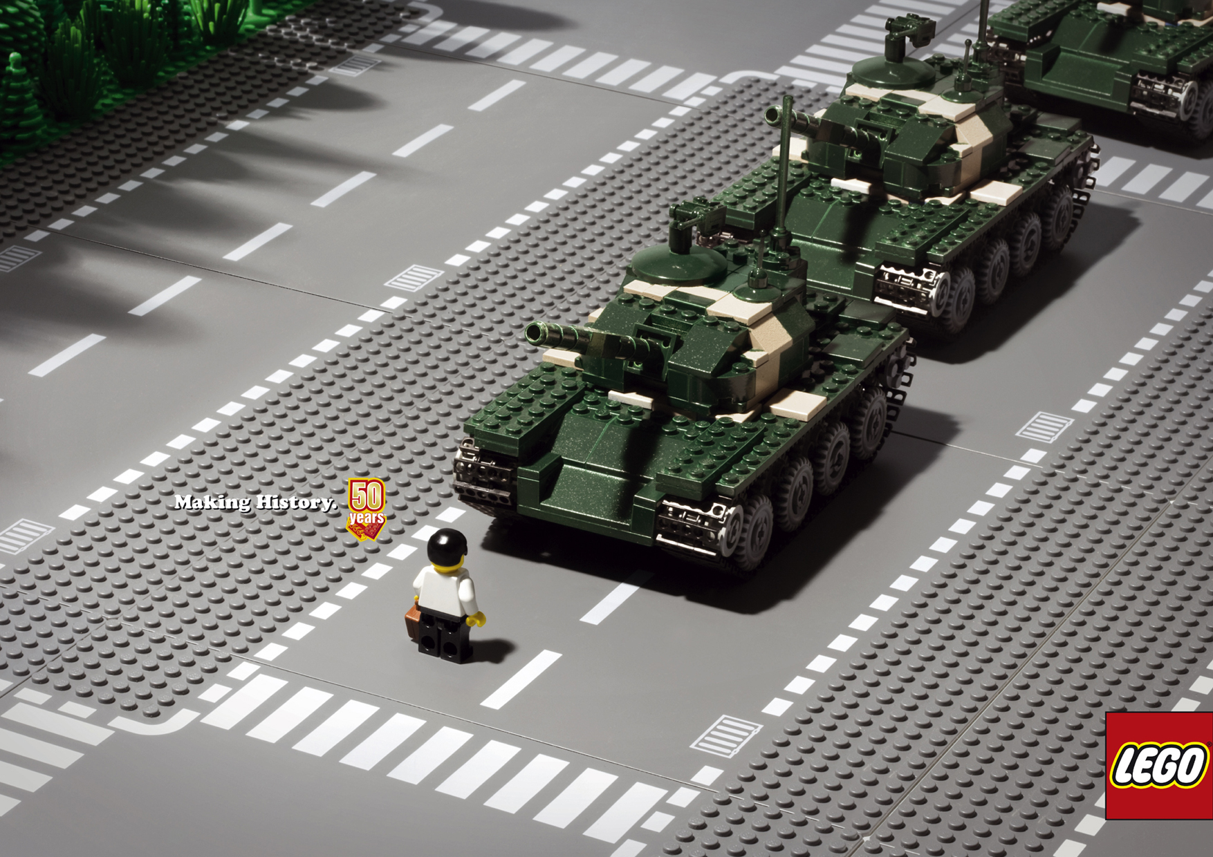 Para añadir todavía brillantez al asunto, les diré que las escenas son parte de la campaña creada para el 50 aniversario de la marca y cuentan para ello, con un copy excelso: Haciendo historia. (Literalmente). Tres imágenes históricas, usadas por Lego para hacerse publicidad y sin pagar un sólo centavo de derechos. Nada mal…