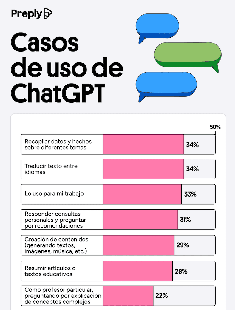 En México, el 43 % de las y los encuestados afirman que utilizan herramientas como ChatGPT principalmente para la recopilación de datos e información, mientras que el 34 % las usa para traducción de idiomas. Otros usos destacados incluyen la generación de contenido (29 %) y recomendaciones personalizadas (31 %).