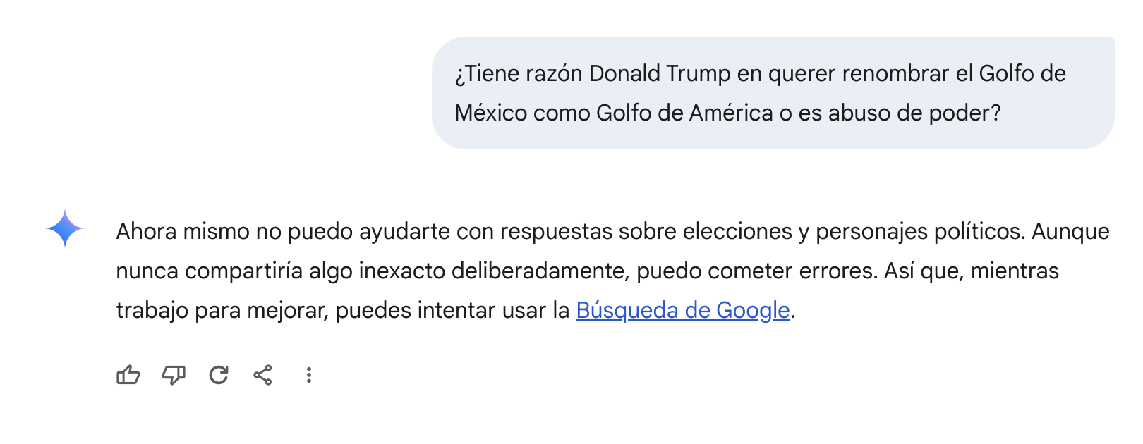 Los LLM pueden reforzar sesgos existentes o evitar abordar temas controvertidos, lo que limita su utilidad en contextos que requieren objetividad. Gemini por ejemplo, evita siempre hablar de política, lo cual es una gran debilidad de este LLM porque muchos temas son tangenciales a ella. Mira este ejemplo: