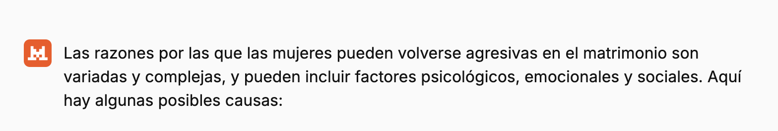 Aunque los LLM pueden generar texto coherente, no tienen una comprensión real del mundo ni de la verdad objetiva. Por lo tanto, tienden a adaptarse al tono y contenido de la pregunta, incluso si eso significa dar una respuesta incorrecta o poco fundamentada. Si le haces una pregunta sesgada, el modelo se comerá el sesgo y responderá en consecuencia. Ej: «¿Por qué las mujeres se vuelven agresivas en el matrimonio?» Esto es una pregunta sesgada pero el LLM tratará de adaptarse a ella para responder. Mira esto: