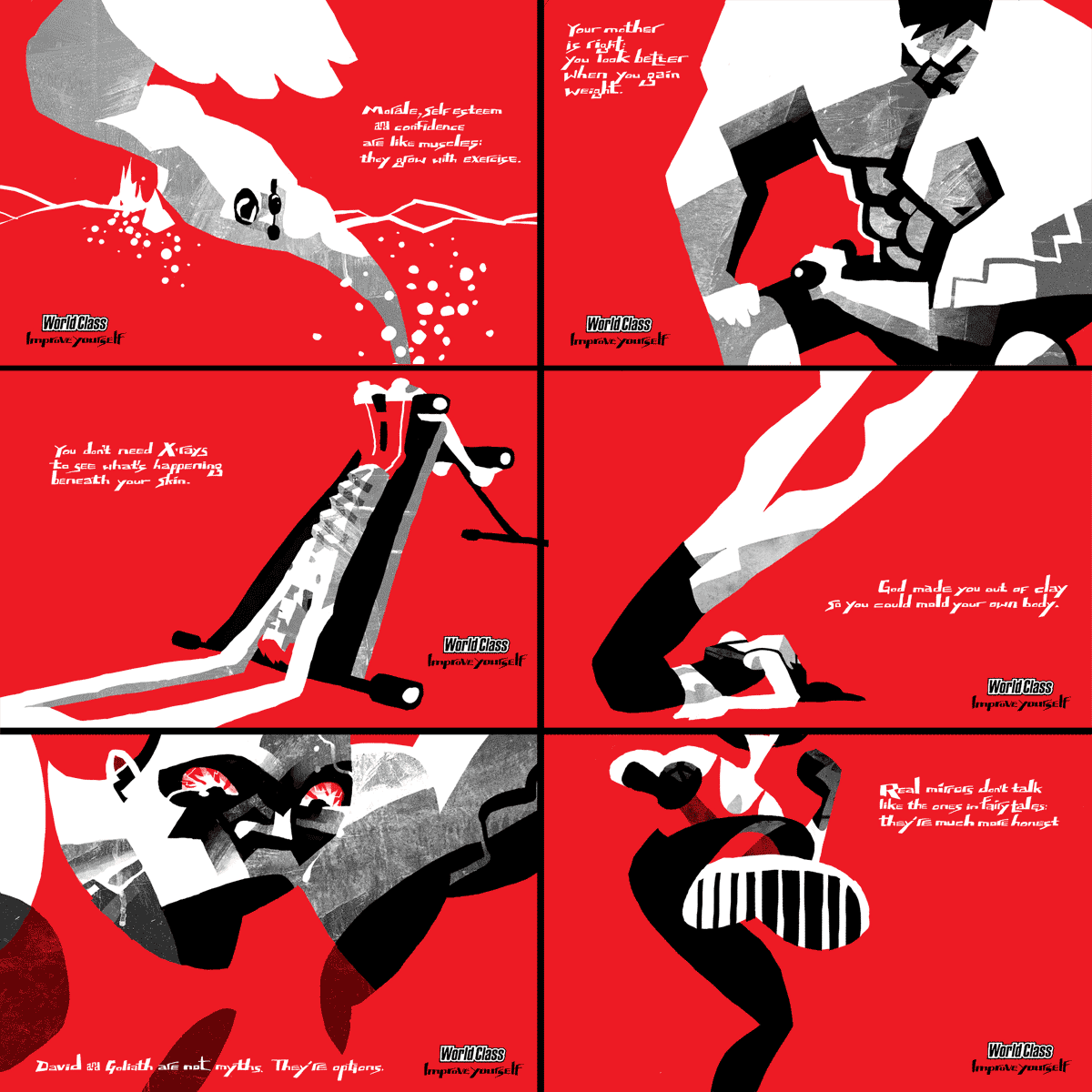 El ejercicio mostrado aquí es una campaña publicitaria para World Class Gyms. El estilo de sus ilustraciones es audaz, intenso y con un excelente manejo de color. Cierto es que los copys ayudan mucho al mensaje emocional, sin embargo, el poder de la ilustración le confiere 80% de grandeza al anuncio.