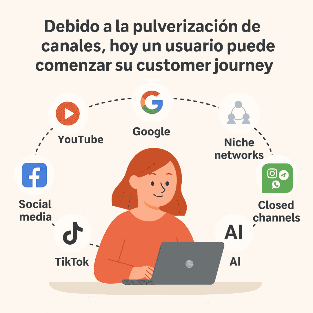 Debido a la pulverización de canales, hoy un usuario puede comenzar a buscar información en una red social, en Google, en la IA, en un canal cerrado como un grupo de Instagram, WhatsApp o Telegram, en TikTok o hasta en canales de nicho.