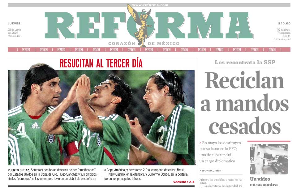 Para los que gustan de los buenos copys, esta extraordinaria cabeza en el diseño del periódico Reforma, aprovechando la circunstancia de que la selección mexicana perdió vergonzosamente la Copa de Oro el pasado domingo y por ende todos los dábamos por muertos para el siguiente cotejo. Sin embargo, en su primera jornada en la Copa América, al tercer día de tan desastrosa actuación, derrotaron al campeón defensor, Brasil, lo que dió pié al creativo título: Resucitan al tercer día, copy que se complementa de forma espléndida con la fotografía de Nery Castillo, quien parece dar gracias al cielo.