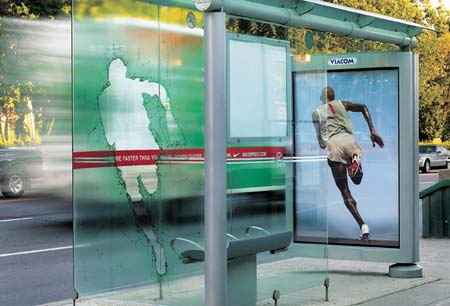 Brillante decisión para publicitar Nike Speed. Un par de parabuses que funcionan como unidad, donde la 1a parte semeja un cristal roto, atravesado obviamente por el corredor que aparece en la segunda. La culpable de esta maravilla es la agencia TAXI de Toronto.