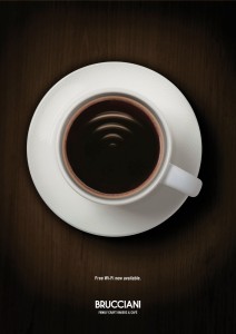 El diseño de Brucciani, que me encantaría verlo en manteletas, se ha sacado oficialmente un 10, no sólo por su sencillez, sino porque ha aprovechado su propio producto para anunciar su red Wi-Fi; así, no solo logra un desarrollo creativo y con un mensaje claro, sino que reafirma su identidad y lo hace sin saturar a sus clientes.