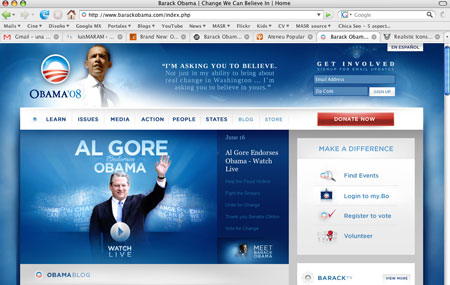 Y es que para muestra dénse una vuelta por el site; si bien es una belleza de estética y usabilidad, no lo es menos en cuanto a mercadotecnia. La frase inical es inspiradora y hoy, por ejemplo, se destaca que Al Gore respalda a Obama, así como un expreso agradecimiento a Hillary Clinton y una invitación a sus seguidores; eso claro, sin mencionar el mecanismo de donación y el video viral que corrió como pólvora muy al estilo Martin Luther King, «Yes we can.»