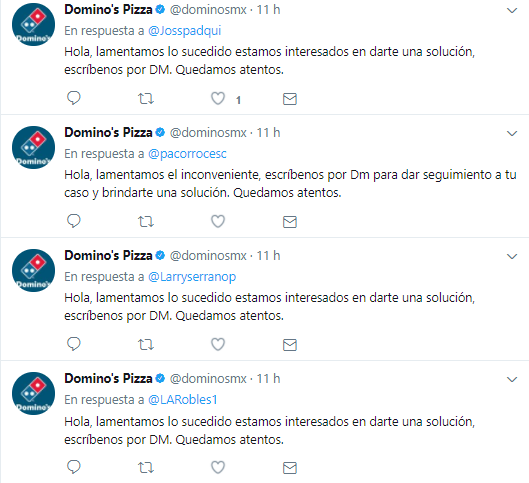 Mira este ejemplo con Domino’s. Ni si quiera hacen el intento. Lamenta lo sucedido en un tuit anterior pero sigue sin resolver nada.