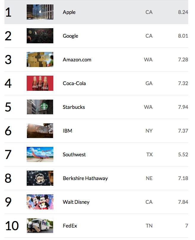 No sorprende ver estos nombres en las diez mejores, incluyendo a Apple como número uno a pesar de la muerte de Steve Jobs.