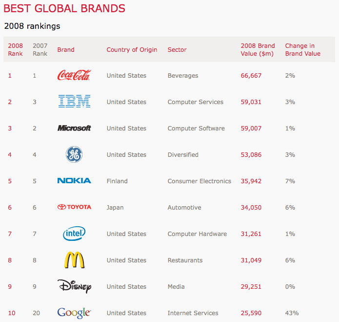 Llama la atención que del Top 10 sólo 2 marcas no pertenezcan a Estados Unidos, cuando acabamos de ver la quiebra del cuarto banco de inversión más grande de esa nación, Lehman Brothers y los tambores de recesión suenan frecuentemente.