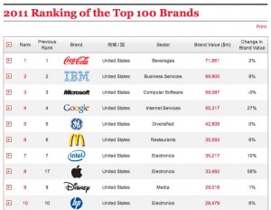 Básicamente es lo mismo que el año pasado salvo que Apple irrumpió en el Top 10 escalando ¡9 lugares! y le arrebató a Nokia el octavo puesto. ¿A alguien sorprende que Coca-Cola sea la mejor marca del mundo? En lo personal, no. Creo que es una de las compañías que mejor entienden el concepto «marca» y por supuesto que lo gestionan a un nivel por arriba de la media superior.