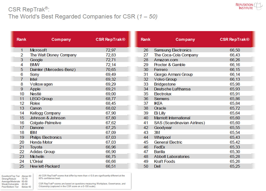 Aquí te dejo el Top 50 de las empresas con mayor responsabilidad social en el mundo, de acuerdo al Reputation Institute.