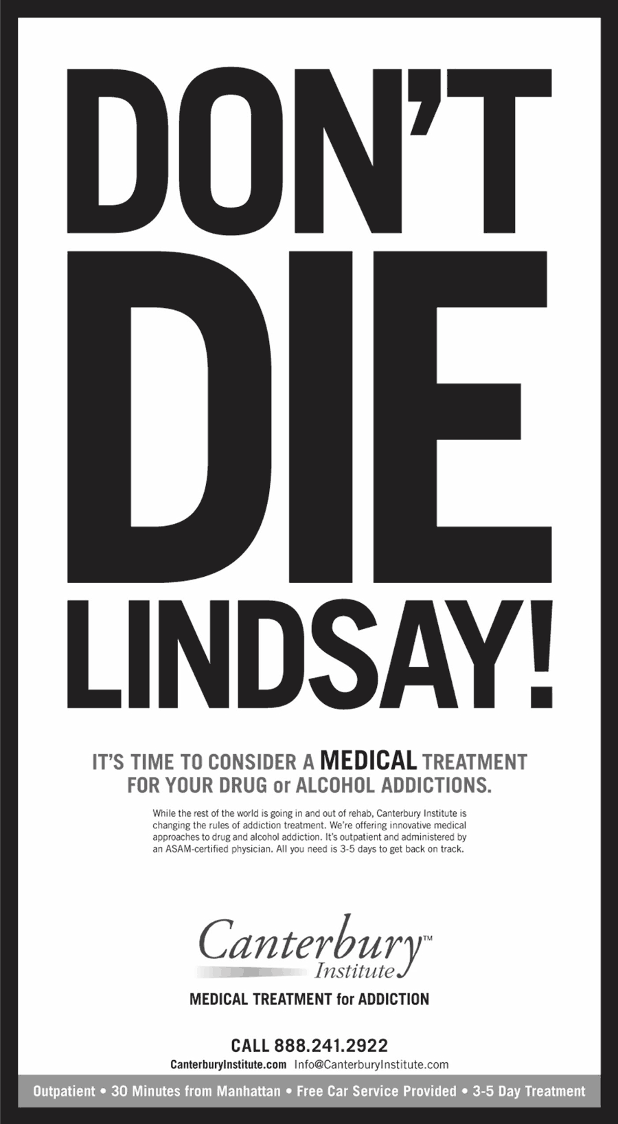 La acción consistió en publicar el anuncio con la cabeza: ¡No te mueras Lindsay! (obviamente sin citar el apellido). Debajo de ello, en el cuerpo, se explicaba que el Instituto Canterburry, responsable de la publicación, era una institución que garantizaba la cura deadicciones con un tratamiento de tres dí­as.