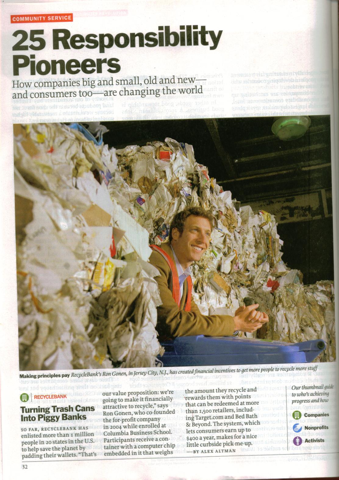 Hasta el momento, RecycleBank ha reclutado a más de 1 millón de personas en 20 estados para ayudar a salvar el planeta a través de sus carteras. «Esa es nuestra propuesta de valor: hacer económicamente atractivo reciclar», dice Ron Gonen, que co-fundó la compañía lucrativa en 2004, mientras que se matriculaba en la Columbia Business School. Los participantes reciben un recipiente con un chip integrado en él que pesa la cantidad que reciclan y los recompensa con puntos que pueden canjear en más de 1.500 minoristas, incluyendo Target.com y Bed Bath.