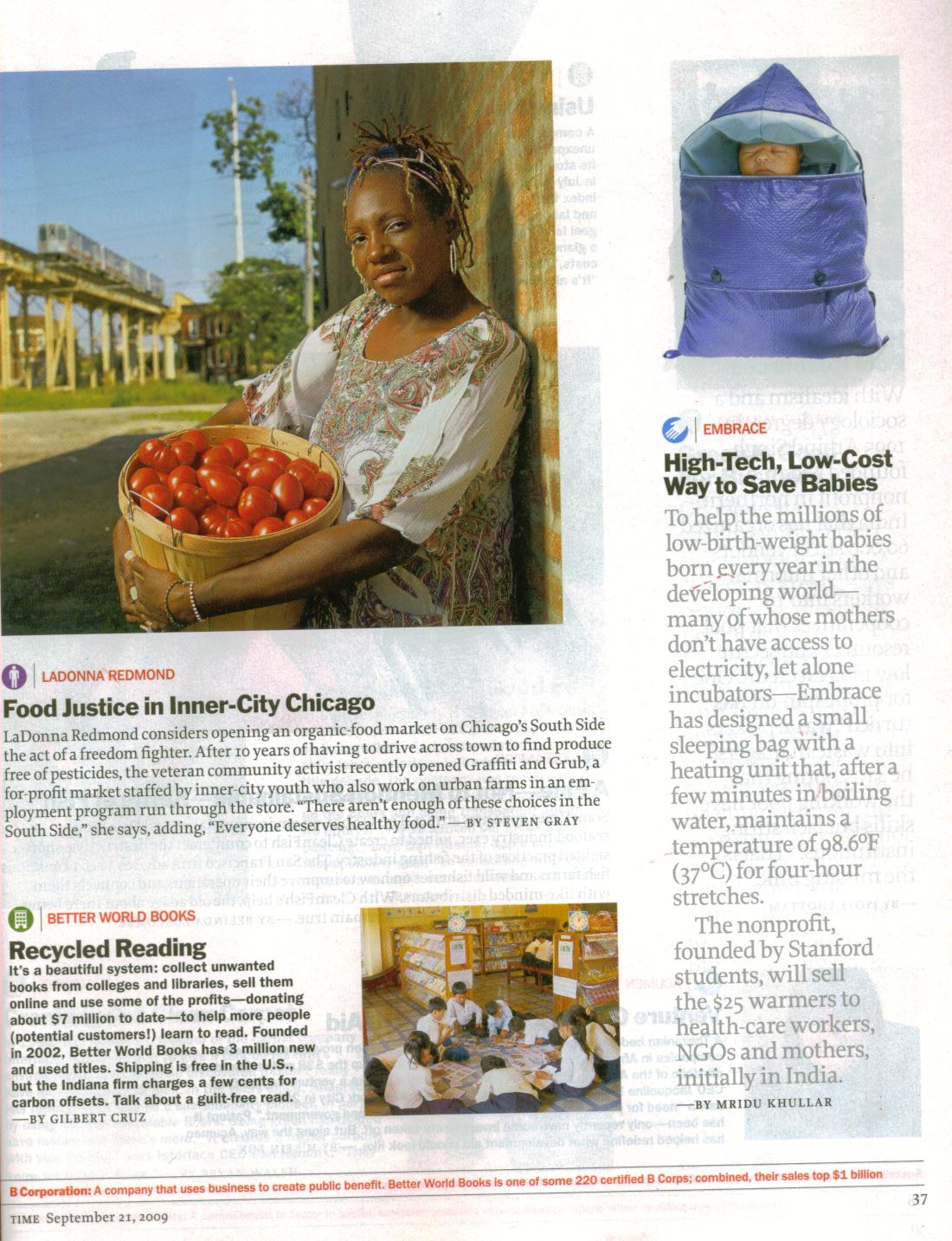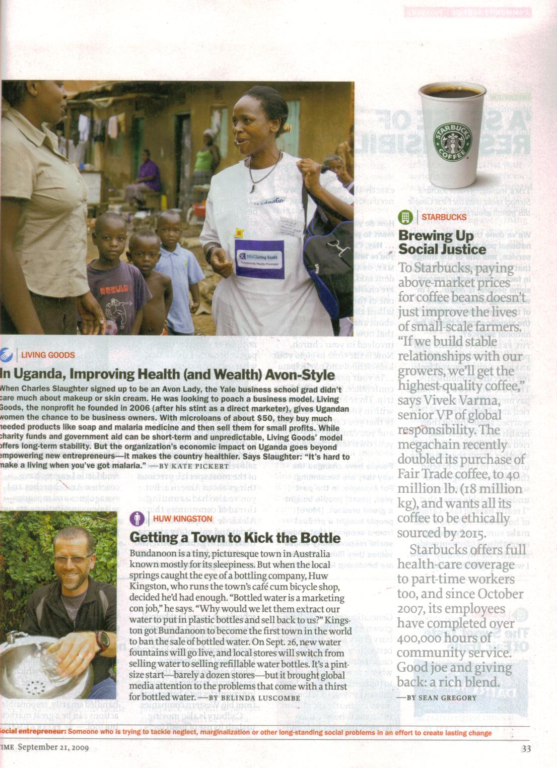 La revista TIME de septiembre trae varios artículos relacionados a la responsabilidad social; destacan una mirada al consumo ético en The Responsibility Revolution, una entrevista a Barack Obama y su esposa y un listado de los 25 Pioneros de la Responsabilidad.