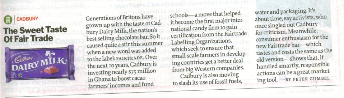 Generaciones de británicos han crecido con el sabor de Cadbury Dairy Milk, la barra de chocolate de mayor venta en su nación. Sin embargo, lo que causó una gran sorpresa este verano, fue una nueva frase añadida a la etiqueta: Comercio Justo. Durante los próximos 10 años, Cadbury estará invirtiendo cerca de US $ 75 millones en Ghana para aumentar los ingresos de los agricultores de cacao y tener escuelas – un movimiento que le ayudó a convertirse en la primera gran empresa de dulces internacionales en obtener la certificación de la Organización Internacional de Etiquetado de Comercio Justo, que tienen por objeto garantizar que los pequeños agricultores en los países en desarrollo reciban un mejor trato de las grandes compañías occidentales. Cadbury también se está moviendo a recortar el uso de combustibles fósiles, el agua y el embalaje. Ya era hora, dicen los activistas, que una vez señalaron a Cadbury. Mientras tanto, el entusiasmo de los consumidores por la «nueva» barra de Comercio Justo, que cuesta lo mismo que la versión anterior, demuestra que, estratégicamente, las acciones de responsabilidad social puede ser una gran herramienta de marketing.