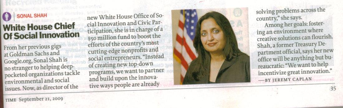 De sus actuaciones anteriores con Goldman Sachs y Google.org, Sonal Shah no es ajeno a las organizaciones que abordan las cuestiones ambientales y sociales. Ahora, como directora de la nueva Oficina de Innovación Social y Participación Ciudadana de la Casa Blanca, está a cargo de un fondo de 50 millones de dólares para impulsar los esfuerzos de entrepreneurs sin fines de lucro y/o sociales. «En lugar de crear nuevos programas, queremos asociarnos y aprovechar las formas innovadoras de la gente que ya participa en la solución de problemas en todo el país», dice ella. Entre sus objetivos destaca la promoción de un entorno en el que las soluciones puedan florecer. Shah, como antigua funcionaria del Ministerio de Hacienda, dice que su nueva oficina estará lejos de ser burocrática: «Queremos ayudar a incentivar la innovación».