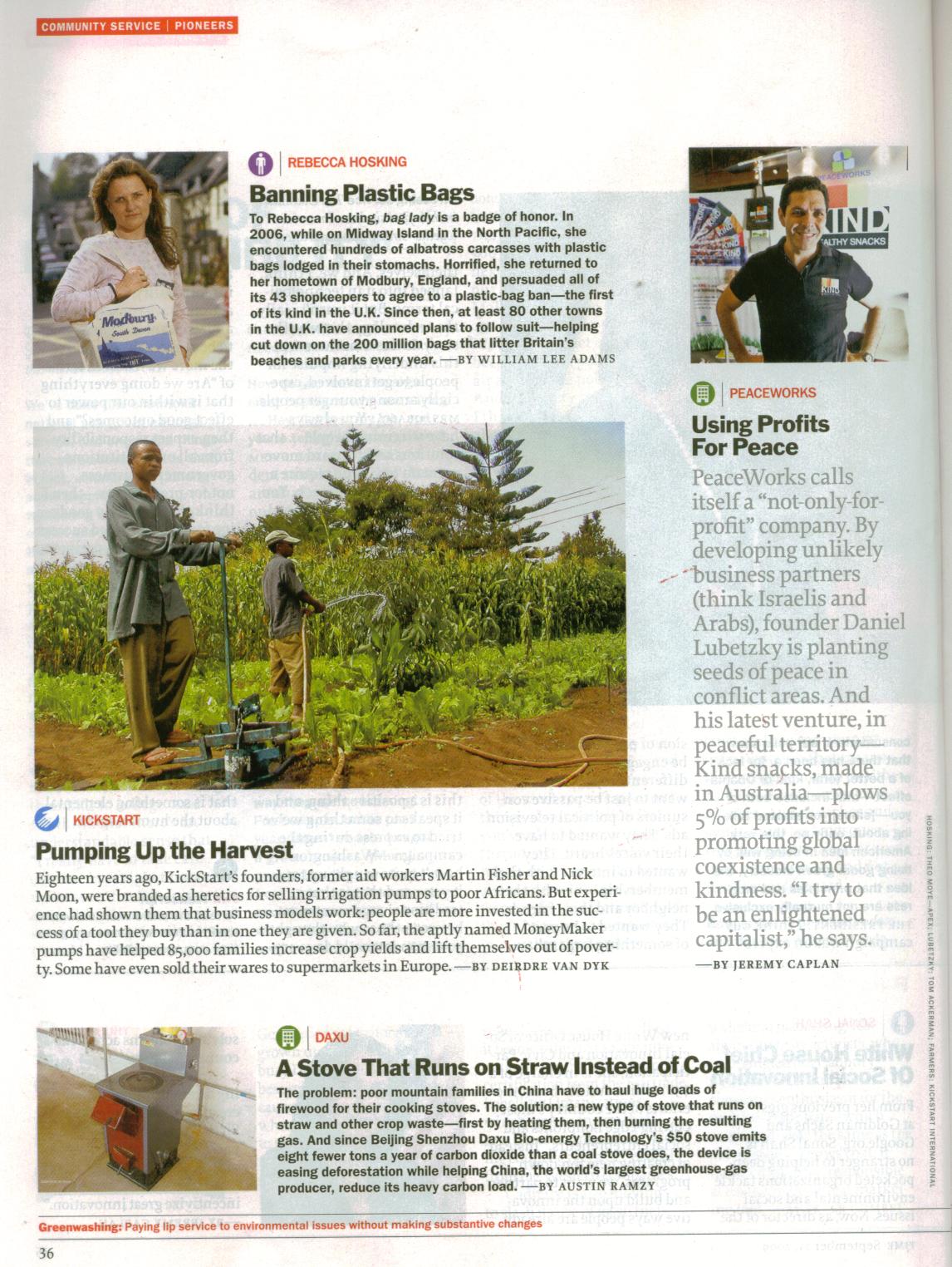 Hace dieciocho años, los fundadores de KickStart, Martin Fisher y Nick Luna, fueron calificados como herejes por la venta de bombas de riego para los africanos pobres. Pero la experiencia ha mostrado el éxito de su modelo de negocio: las personas cuidan e invierten más en las herramienta que compran que en aquellas que se les dan. Hasta ahora, sus bombas han ayudado a 85.000 familias a aumentar la producción agrícola y salir de la pobreza. Algunas de ellas incluso han vendido sus productos a los supermercados en Europa.