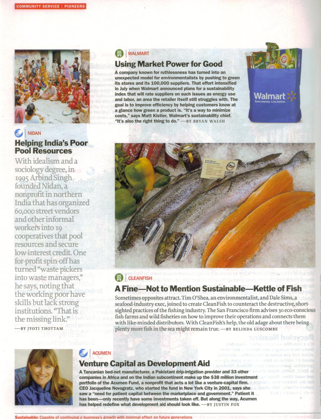 Una fabricante de camas en Tanzania, un fabricante irrigadores por goteo de Pakistán y otras 33 empresas en África y en el subcontinente indio componen la cartera de inversiones de 38 millones dólares del Fondo Acumen, organización sin fines de lucro que actúa como una firma de capital de riesgo. La CEO, Jacqueline Novogratz, quien comenzó el fondo, en Nueva York en 2001, dice que vió una «necesidad de capital entre el mercado y el gobierno.» Acumen ha ayudado a redefinir lo que la ayuda al desarrollo debe ser.
