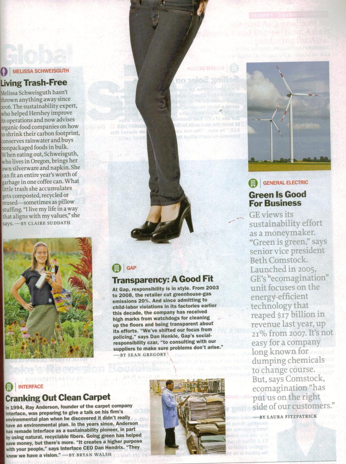 GE considera su esfuerzo por la sostenibilidad como una fuente de ganancias. «Verde es verde», dice el vicepresidente de Beth Comstock. Lanzada en 2005, la unidad «GE ecomagination» se centra en la tecnología de eficacia energética; ellos obtuvieron $ 17 billones en ingresos el año pasado, un alza de 21% con referencia al 2007. No es fácil para una empresa criticada por el dumping de productos químicos, cambiar de rumbo. Pero Ecomagination «nos ha colocado en el lado correcto de nuestros clientes».