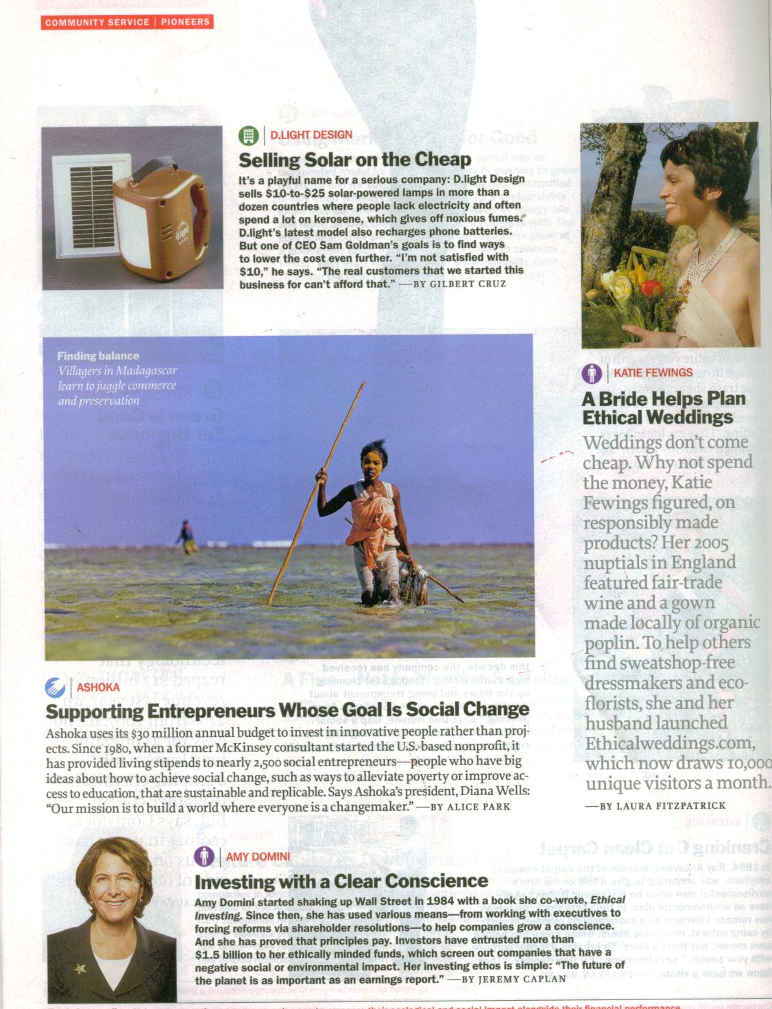 Las bodas no son baratos ¿Por qué entonces no gastar el dinero con responsabilidad sobre los productos comprados? Ése es el negocio de Katie Fewings, en cuya boda en Inglaterra en 2005 se sirvió vino de comercio justo y utilizó un vestido hecho de popelina orgánicoa. Para ayudar a otros a encontrar casas de moda que no utilicen sweat-shops para manufactura, así como para hallar eco-floristas, ella y su esposo lanzaron Ethicalweddings.com, que ahora atrae a 10.000 visitantes únicos al mes.