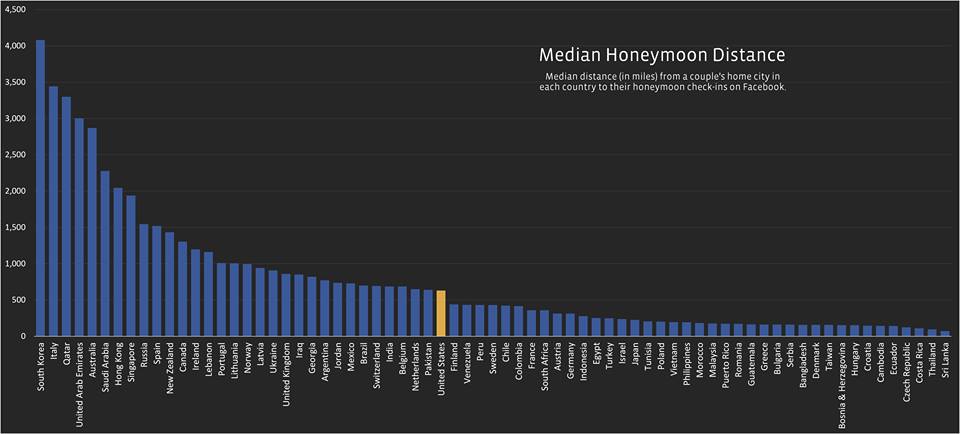 El Equipo de Datos de Facebook analizó los principales destinos de luna de miel basados en los check-ins y creó la siguiente gráfica donde se muestra la distancia media recorrida para las lunas de miel por país.