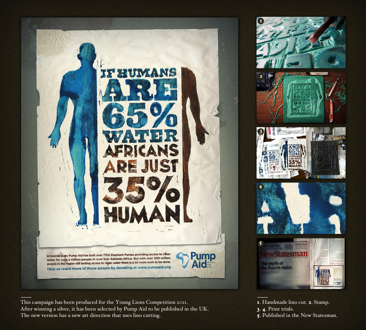 El diseño ganó plata en los Young Lions de 2011, y tras hacerlo, Pump Aid decidió publicarlo en Reino Unido, en anuncios de prensa y en gráficos exteriores impresos artesanalmente sobre lino, logrando así un muchísimo mayor impacto debido a la enorme riqueza de texturas y colores.