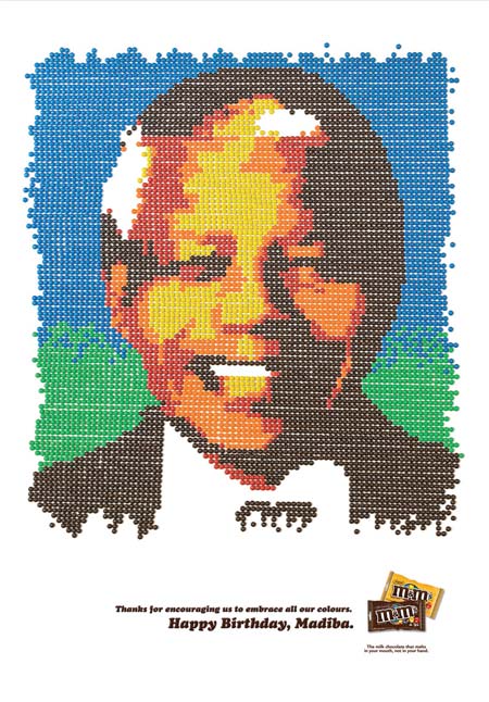 í‰ste, sin duda alguna, es una belleza. La marca de chocolates m&m’s, famosa por sus múltiples colores, generó, a base de grageas, un retrato de Mandela y le agregó un copy que raya lo excelso: Gracias por impulsarnos a mostrar nuestros colores. Feliz cumpleaños, Madiba.