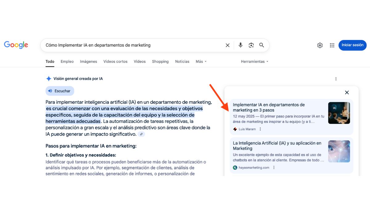 1. Ser la fuente de autoridad de la IA: Las inteligencias artificiales no tienen conocimiento propio; son herramientas de síntesis. Para que una IA te cite, primero debe considerar tu sitio como una fuente fiable y autorizada. Tu contenido se convierte en el «corpus de conocimiento» que la IA consume para responder a sus usuarios. Estar en la lista de fuentes citadas es el nuevo ranking. Aquí es donde se vuelve altamente relevante el aprender a aparecer en estas herramientas y en sus funciones como los AI Overviews de Google. Esto es la Optimización para Motores Generativos (GEO). Cabe resaltar que al ser un paradigma naciente, su forma de medirlo es aún incierta.